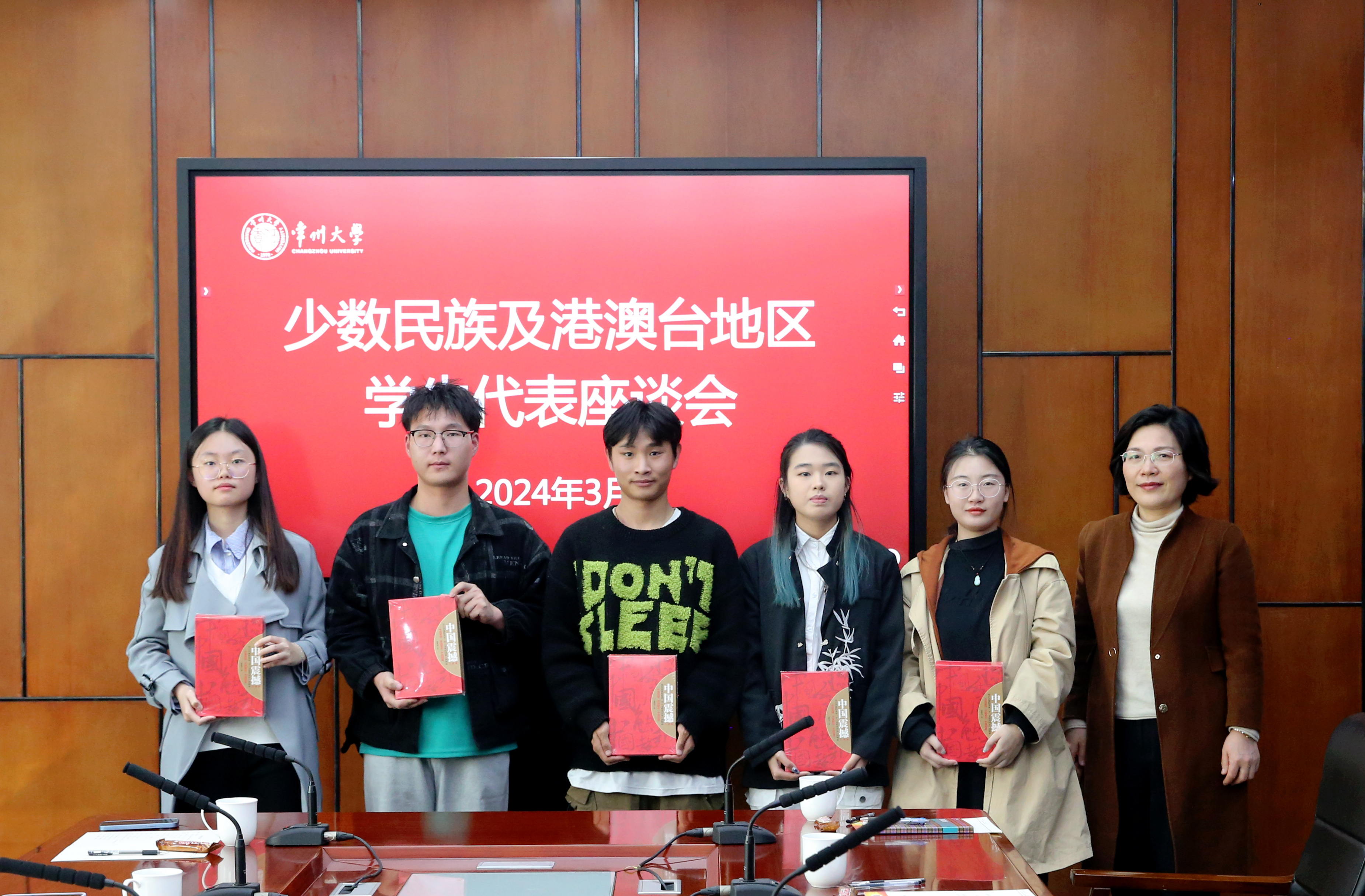 与会领导为同学们赠送了书籍——《中国震撼三部曲》,期待同学们能够从中感悟中国崛起、感知中国力量,不断增强同心共筑中国梦的行动自觉,在美丽的常大校园里绽放绚烂的青春之花。