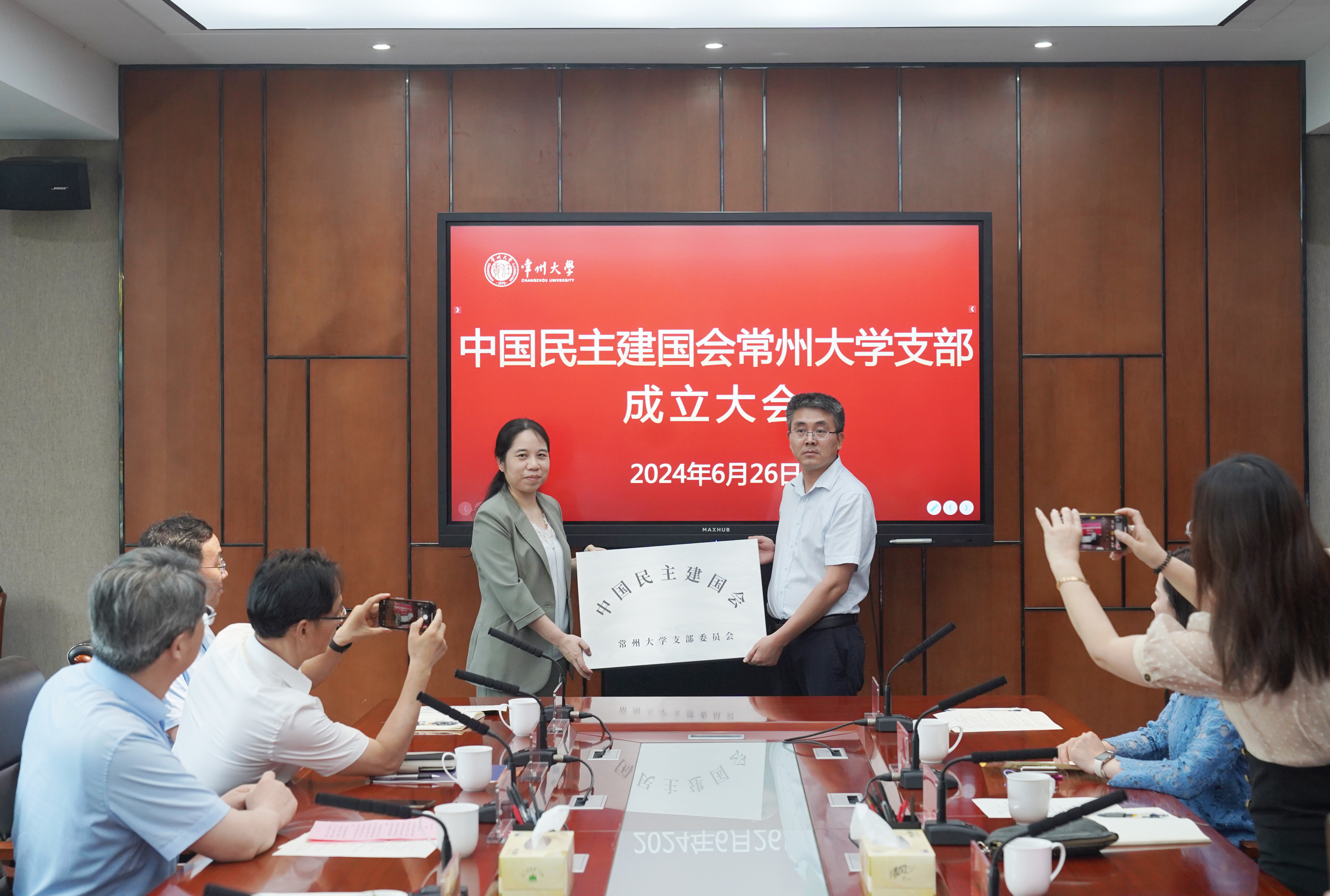 会议宣读了成立民建常州大学支部的决定,宣布了支部主委、副主委及委员名单。陆慧琦向民建常大支部授牌。孟启代表学校各民主党派基层组织、统战团体联合致贺词。