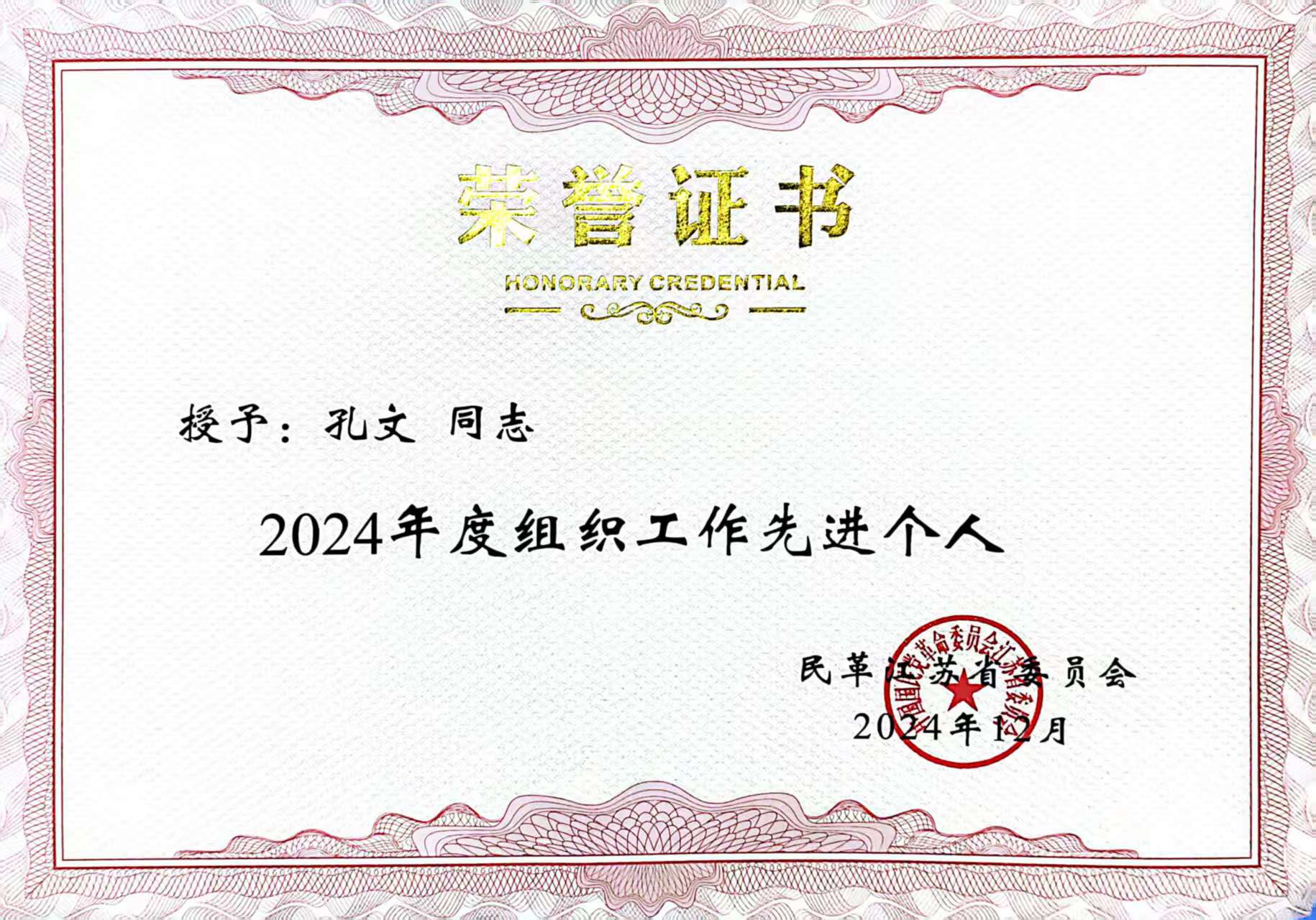 2024年12月28日,民革江苏省第十二届委员会第四次会议在南京召开,会上表彰了民革江苏省委会2024年度各项工作先进集体、先进个人。我校民革支部主委孔文获评“2024年度组织工作先进个人”。