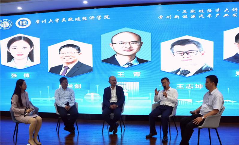 5月23日下午,学院与常州市委统战部联合主办的“吴敬琏经济大讲堂”第四讲在常州大学西太湖校区立言楼458报告厅举行,主题为“常州新能源汽车产业发展之路探析”。国务院发展研究中心市场经济研究所副所长王青,常州市委常委、统战部部长杨芬,常州大学党委副书记、校长陈海群,常州市委统战部副部长汤建忠,蜂巢能源科技股份有限公司执行董事、党委书记王志坤,常州百利锂电智慧工厂有限公司董事长兼总经理虞兰剑,万帮星星充电科技有限公司执行董事郑隽一,常州钟金控集团副总经理张倩,中国人民银行常州分行货币信贷政策管理科副科长徐芳等政产学研各行业代表,以及常州大学吴敬琏经济学院师生代表参与本次活动。活动由常州大学党外知识分子联谊会会长、吴敬琏经济学院院长姜国刚主持。