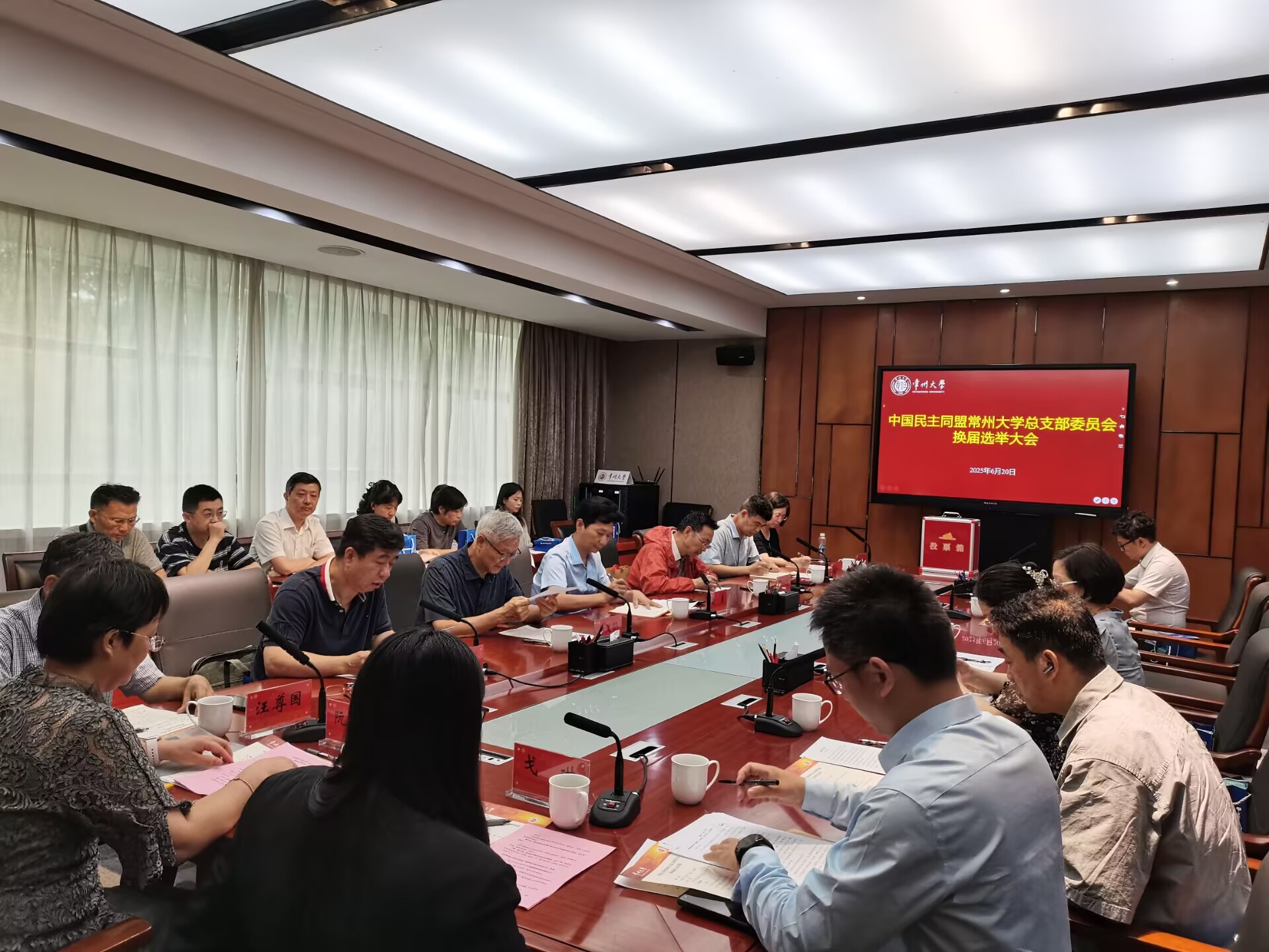 全体与会盟员按照民盟基层组织换届选举流程进行了民盟常州大学总支部第二届委员会选举。选举石林为民盟常州大学总支部第二届委员会主任委员,戈琳、郑剑锋、谢毅鹏为副主任委员,石运达、李涛、邱菲、周子尧、徐德锋为委员。曹永忠处长主持了第二届委员会第一次全体委员会议,明确各委员分工。