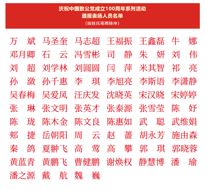 中国致公党成立100周年庆祝大会9月19日在北京举行。习近平总书记专门发来贺信,代表中共中央表示热烈祝贺,向致公党全体同志致以诚挚问候。10月10日,致公党中央办公厅发布《关于对庆祝中国致公党成立100周年系列活动中表现突出的个人予以表扬的决定》,对在隆重庆祝致公党百年华诞系列活动筹备中表现突出的63名同志予以通报表扬,致公党常州大学支部刘超老师名列其中。