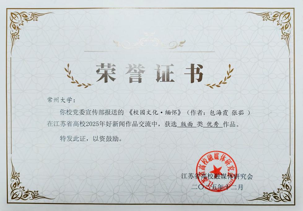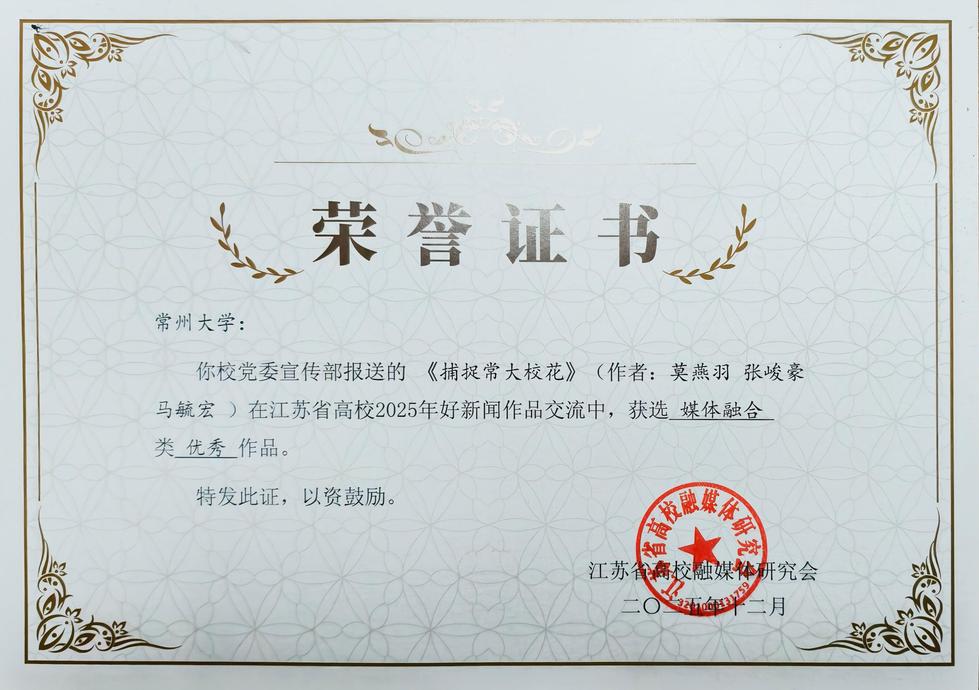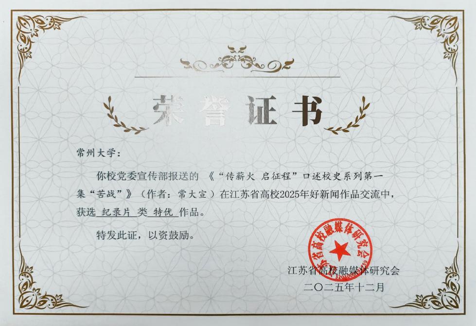 日前,江苏省高校2025年好新闻作品交流评选结果揭晓,我校校报共5件作品获奖。其中,我校集体创作的纪录片《“传薪火 启征程”口述校史系列第一集“苦战”》获纪录片类“特优”奖,包海霞、盛熠老师联合报道的《“绣”好学生就业“百景图”》获文字作品类“优胜”奖,盛熠老师撰写的《点燃科创“新引擎”,跑出发展“加速度”》获文字作品类“优胜”奖,莫燕羽、张峻豪、马毓宏联合报道的《捕捉༲常大༲校花》获媒体融合类“优秀”奖,包海霞、张茹老师联合编撰的《校园文化·缅怀》获版面类“优秀”奖。