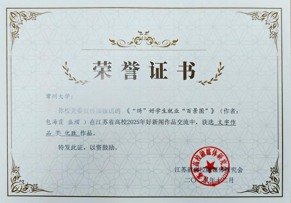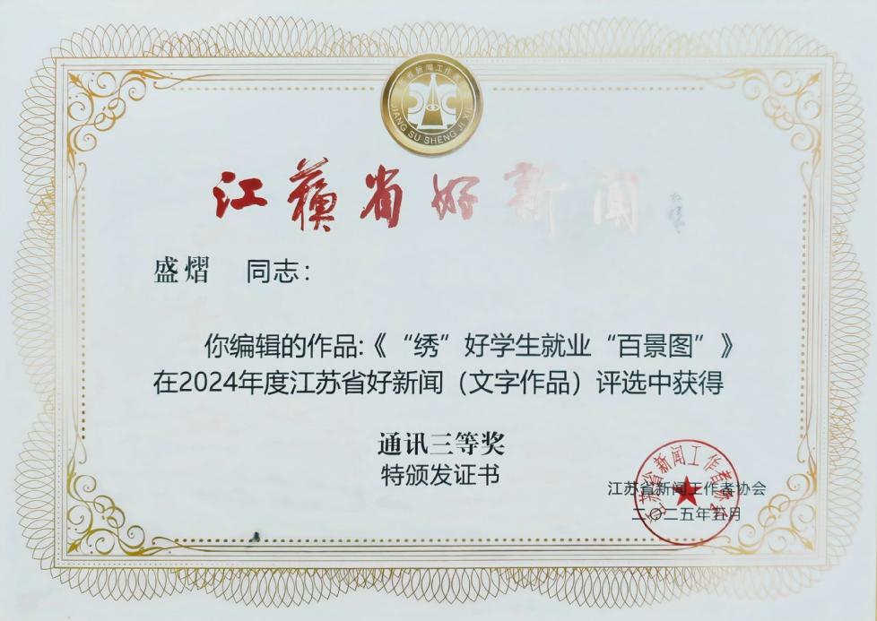 在2024年度“江苏省好新闻奖”评选中,包海霞、盛熠老师联合报道的《“绣”好学生就业“百景图”》获得通讯类三等奖。