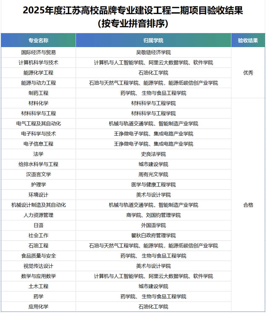 江苏省教育厅发布《省教育厅关于公布2025年度江苏高校品牌专业建设工程二期项目验收结果的通知》(苏教高函〔2025〕13号),我校26个专业全部通过验收,其中国际经济与贸易、计算机科学与技术、能源化学工程、能源与动力工程和制药工程等专业验收结果为“优秀”,优秀数量位列全省并列第一。