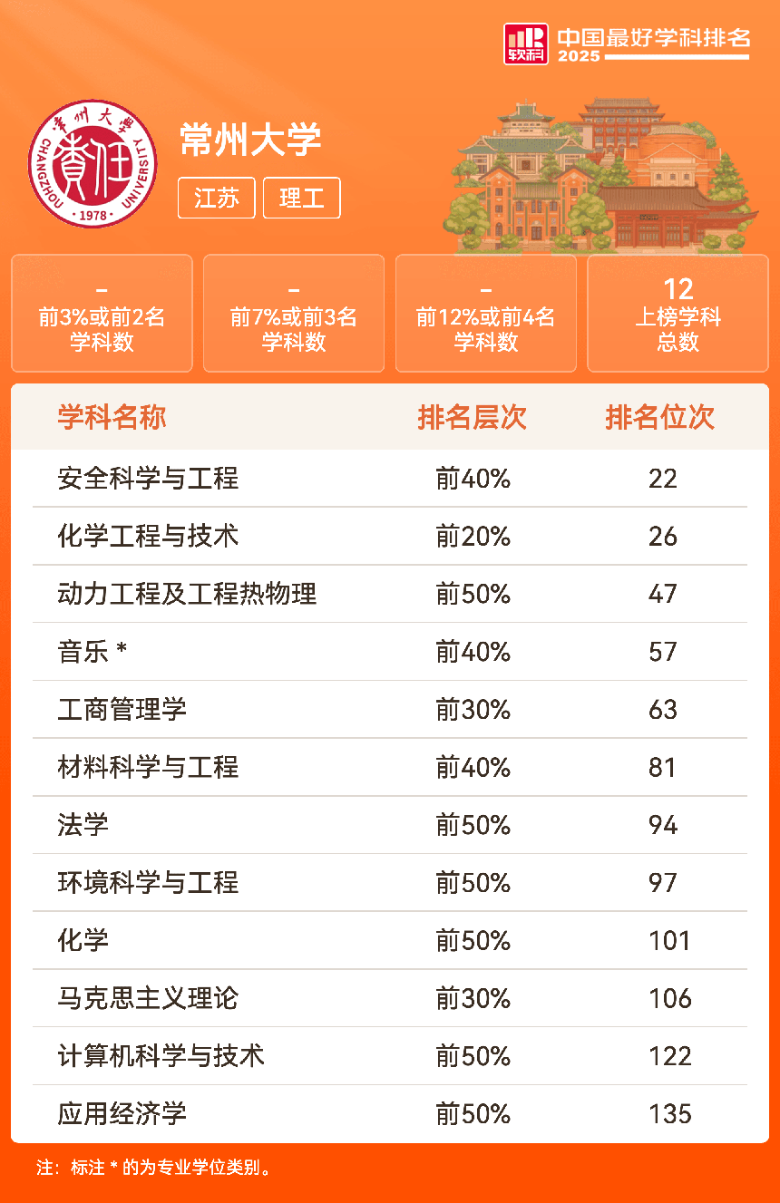 10月15日,高等教育评价机构软科正式发布“2025软科中国最好学科排名”。常州大学应用经济学、法学、马克思主义理论、化学、材料科学与工程、动力工程及工程热物理、计算机科学与技术、化学工程与技术、环境科学与工程、安全科学与工程、工商管理学、音乐共12个学科上榜“2025软科中国最好学科排名”,上榜学科数创历史新高!